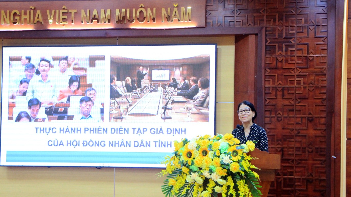 Bà Nguyễn Thị Kỳ, nguyên Giám đốc Trung tâm Bồi dưỡng đại biểu dân cử trao đổi chuyên đề: Thực hành kỹ năng chất vấn tại hội trường của đại biểu HĐND