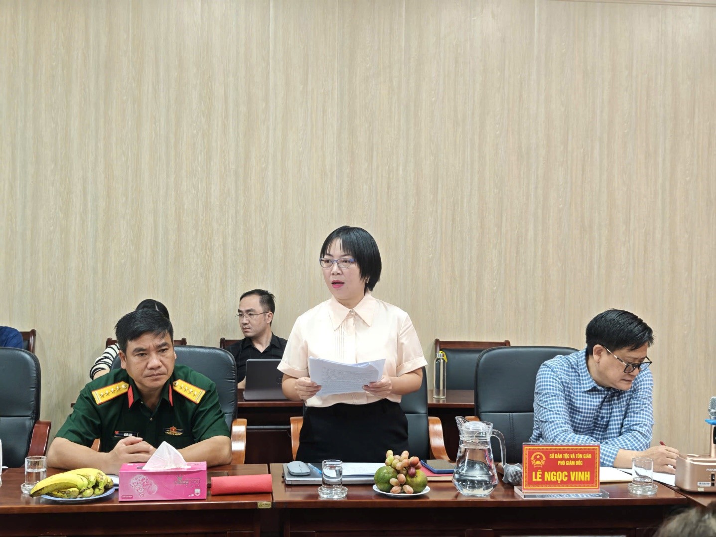 Đ/c Lê Thị Thanh Bích, Phó Giám đốc Sở Dân tộc và Tôn giáo báo cáo kết quả thực hiện Chương trình MTQG phát triển kinh tế - xã hội vùng đồng bào dân tộc thiểu số và miền núi giai đoạn 2021-2025