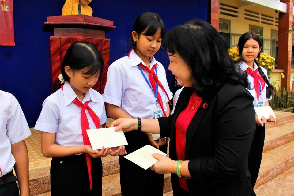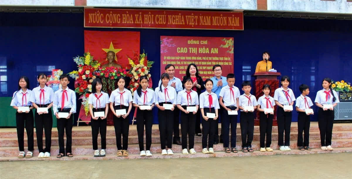 Đ/c Cao Thị Hoà An cùng các đồng chí lãnh đạo trao quà cho học sinh khó khăn
