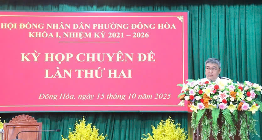 Sáng 15/10/2025, HĐND phường Đông Hòa khóa I, nhiệm kỳ 2021 - 2026 tổ chức Kỳ họp chuyên đề lần thứ hai. Các đồng chí: Lê Văn Thìn, Tỉnh ủy viên, Bí thư Đảng ủy, Chủ tịch HĐND phường Đông Hòa; Đỗ Thị Thu Vũ, Uỷ viên BTV Đảng uỷ, Phó Chủ tịch HĐND phường Đông Hòa chủ trì kỳ họp.
