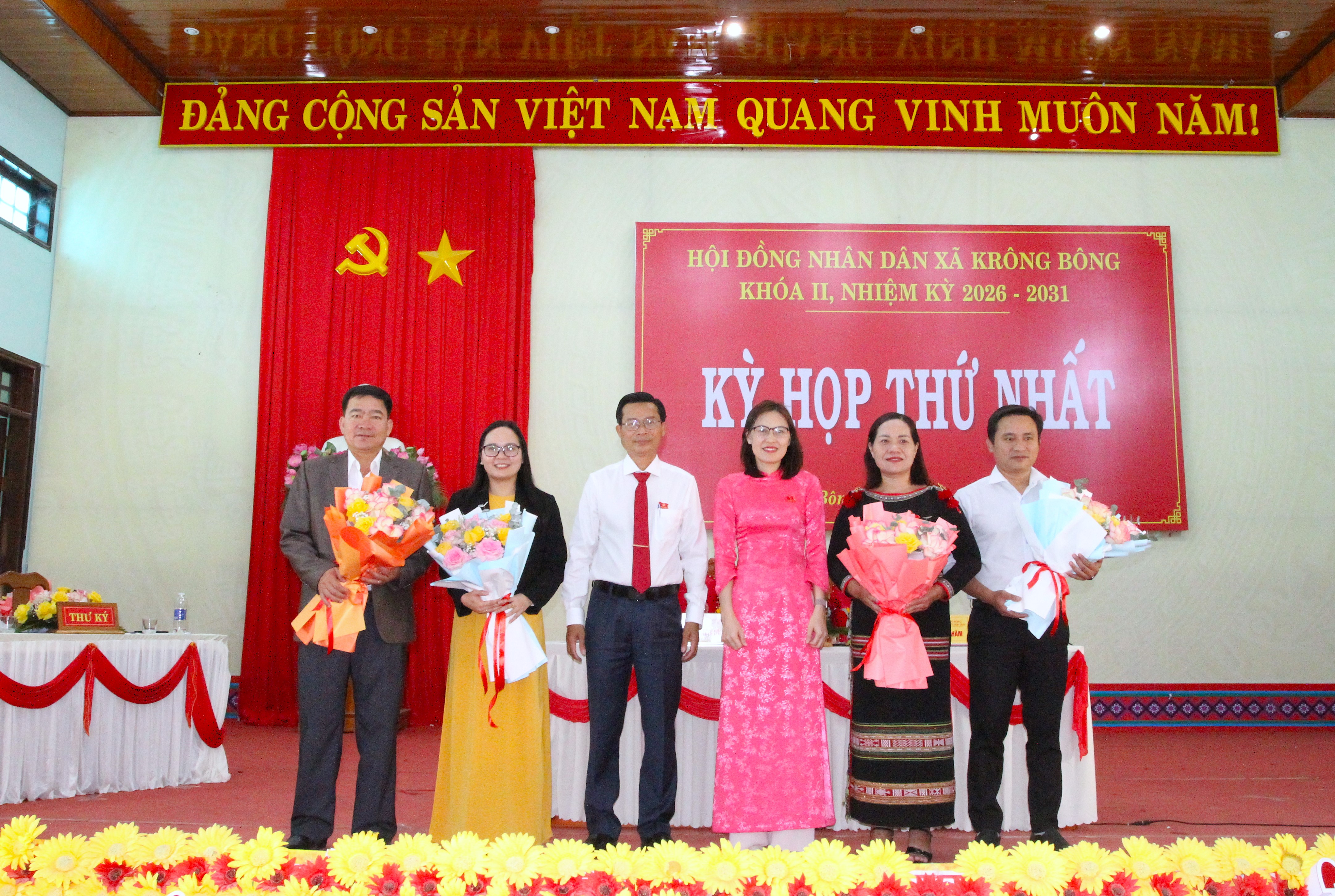 Ảnh 2: Các đại biểu tặng hoa chúc mừng các ông bà được bầu vào lãnh đạo chủ chốt của HĐND xã Krông Bông khóa II, nhiệm kỳ 2026 -2031.