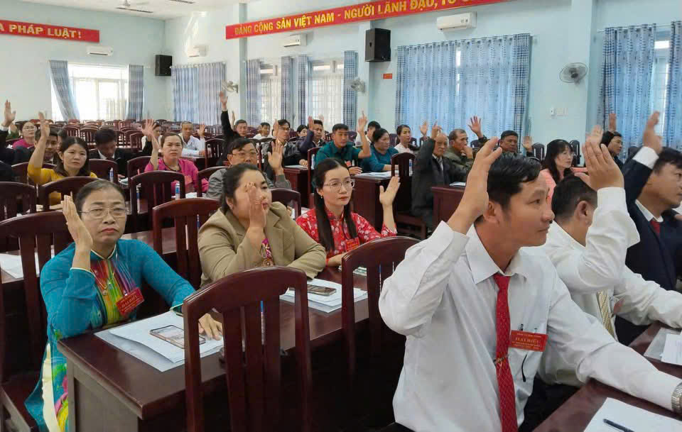 Các vị đại biểu HĐND xã biểu quyết thông qua nghị quyết trình kỳ họp