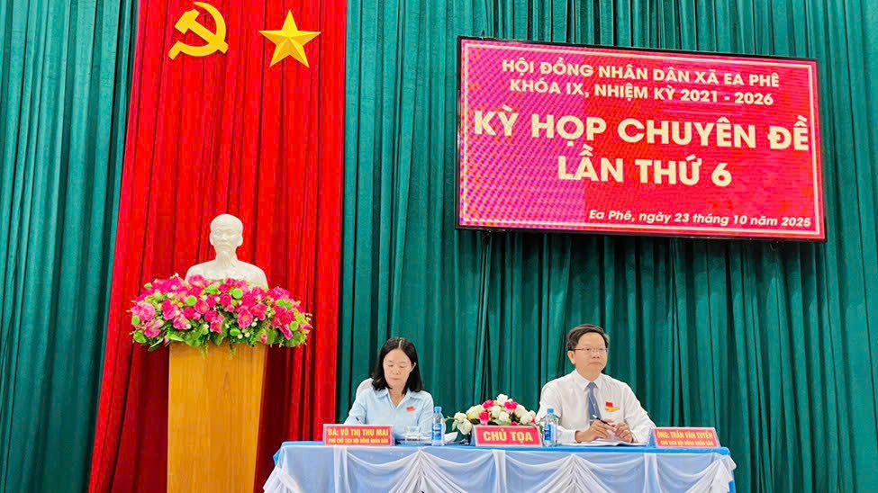 Sáng ngày 23/10/2025, Hội đồng Nhân dân xã Ea Phê khóa IX đã tổ chức Kỳ họp Chuyên đề lần thứ Sáu. Ông Trần Văn Tuyến, Bí thư Đảng ủy, Chủ tịch HĐND xã và bà Võ Thị Thu Mai, UVBTV Đảng ủy, Phó Chủ tịch HĐND xã, Chủ toạ Kỳ họp. Tham dự kỳ họp có các ông, bà trong Ban Thường vụ Đảng uỷ, lãnh đạo Ủy ban Nhân dân xã, Ban Thường trực Ủy ban mặt trận Tổ quốc Việt Nam xã; lãnh đạo các cơ quan, phòng, ban của xã và 60/72 đại biểu HĐND xã khoá IX.