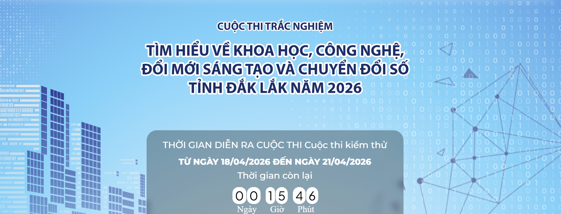 Nhằm tuyên truyền, nâng cao nhận thức về vai trò của khoa học, công nghệ, đổi mới sáng tạo và chuyển đổi số. Ngày 12/4/2026, Ban Tổ chức Cuộc thi trắc nghiệm tìm hiểu về khoa học, công nghệ, đổi mới sáng tạo và chuyển đổi số - Sở Khoa học và Công nghệ tỉnh ban hành Quyết định số 113 /QĐ-BTC về việc ban hành Thể lệ tổ chức Cuộc thi trắc nghiệm trực tuyến tìm hiểu về khoa học, công nghệ, đổi mới sáng tạo và chuyển đổi số tỉnh Đắk Lắk năm 2026.