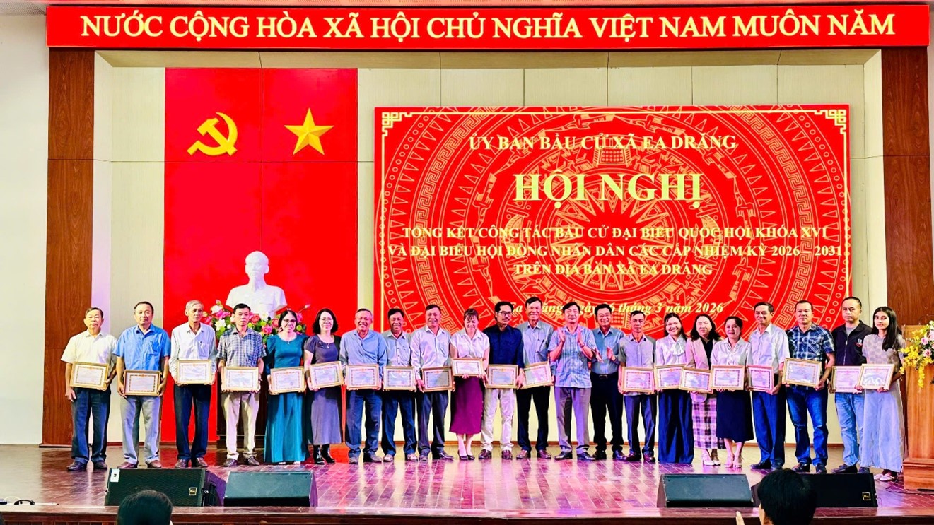 Nhân dịp này, UBND xã Ea Drăng tặng giấy khen cho 19 tập thể và 139 cá nhân có thành tích tiêu biểu trong công tác bầu cử đại biểu Quốc hội khóa XVI và đại biểu HĐND các cấp nhiệm kỳ 2026–2031.
